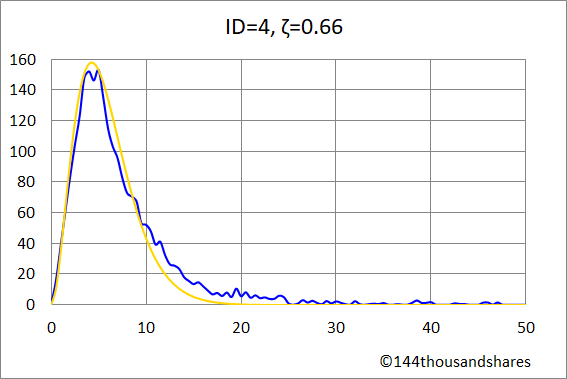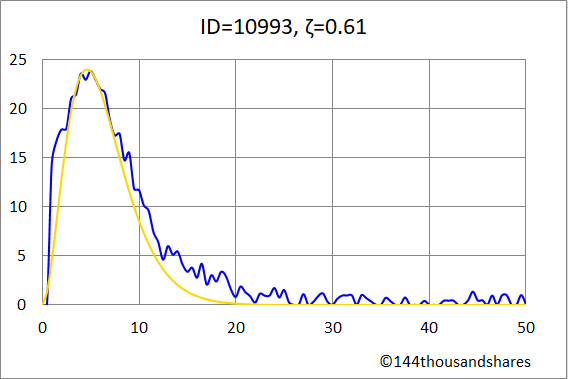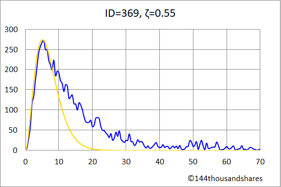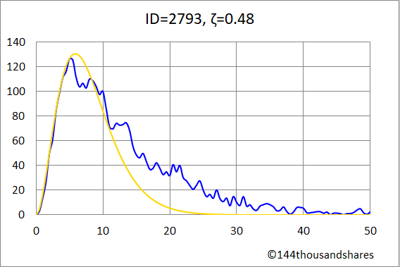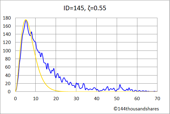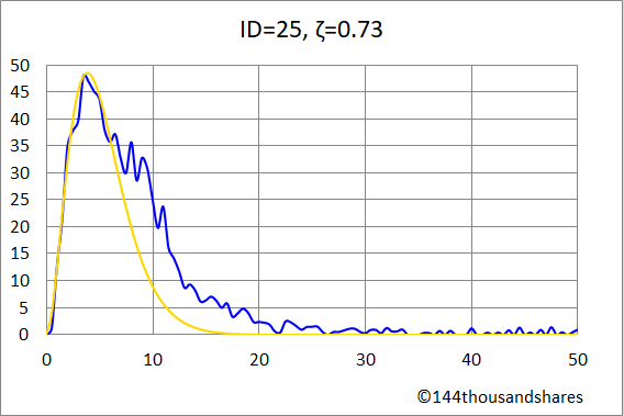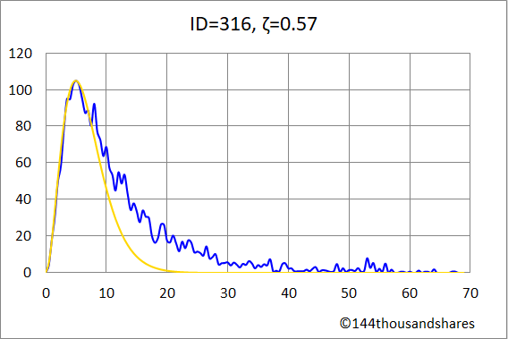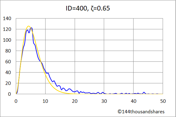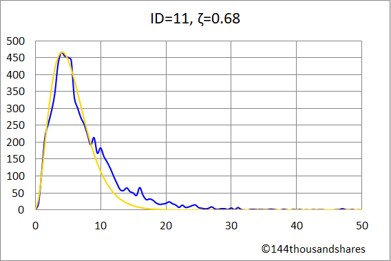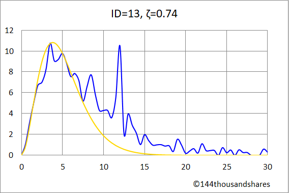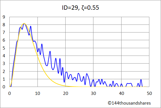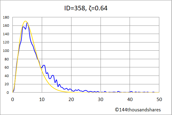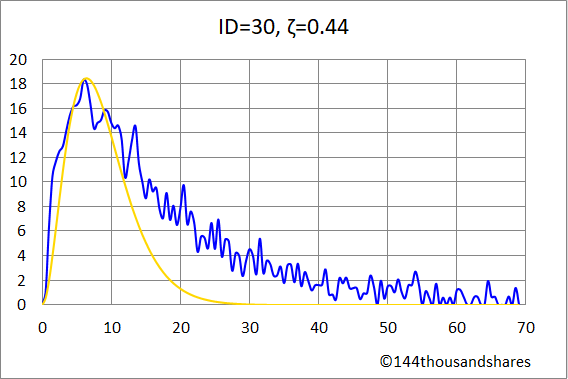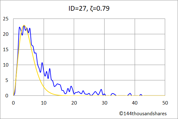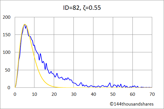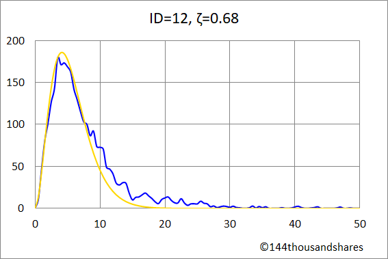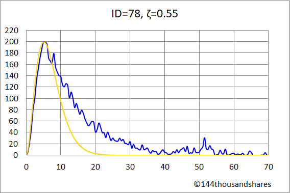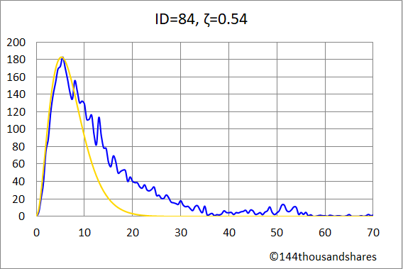 グラフの説明 ※ID=NCBIの旧ID ※ζ=1万×c2/kT ※kT=細胞宇宙の最大kT(原子質量単位) ※c=細胞宇宙光速度 ※青線=タンパク質の質量分布 ※黄色線=プランク分布フィッティング ※横軸単位=1万分子量、縦軸単位=100万分子量 |