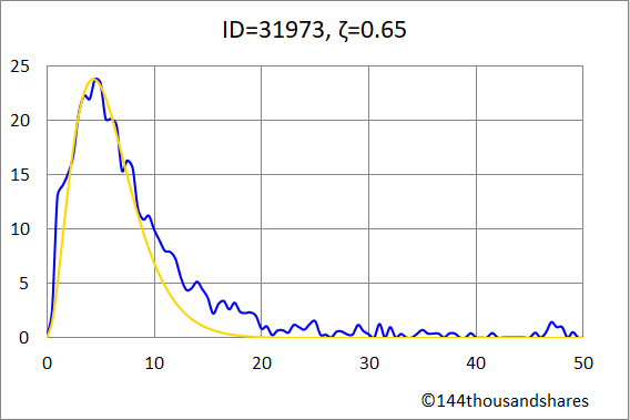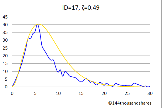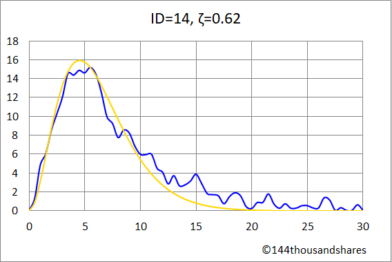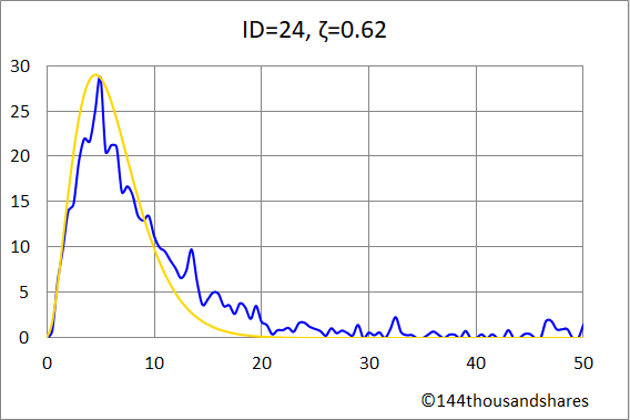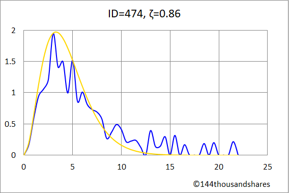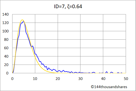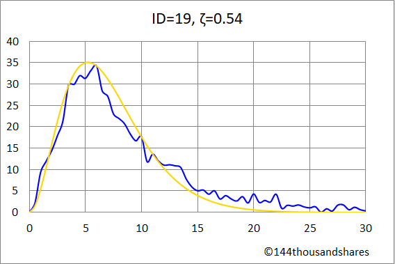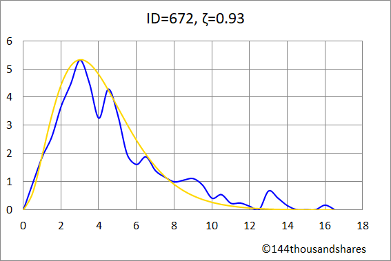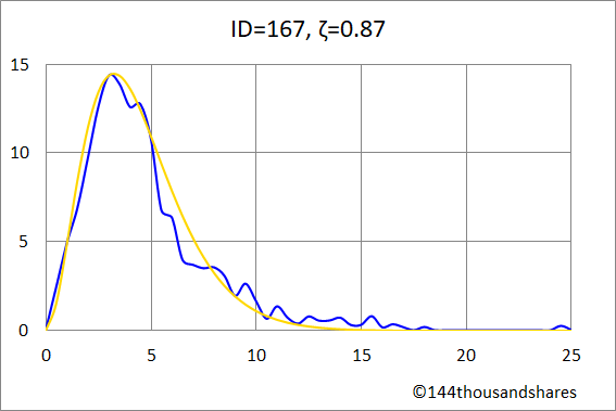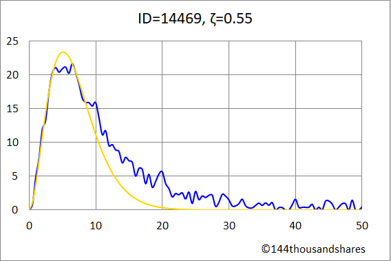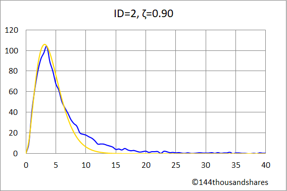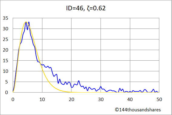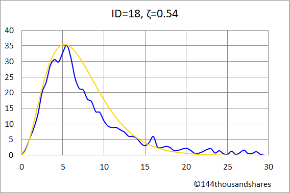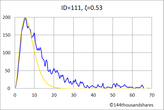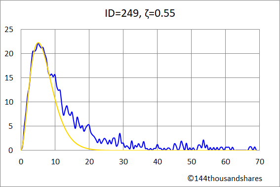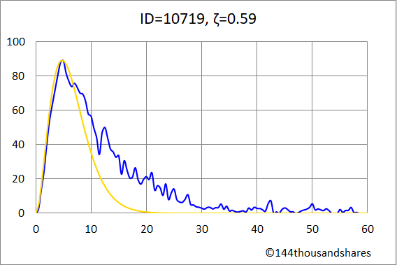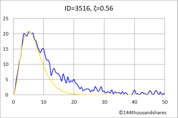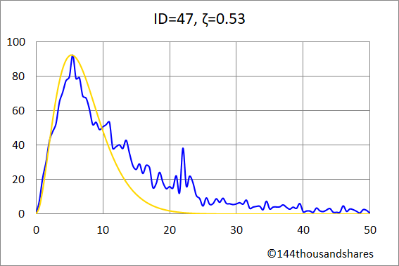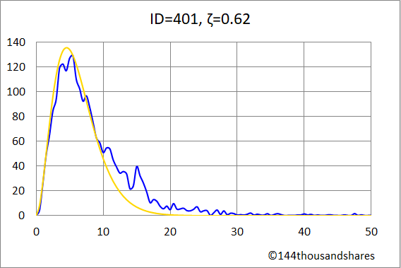 グラフの説明 ※ID=NCBIの旧ID ※ζ=1万×c2/kT ※kT=細胞宇宙の最大kT(原子質量単位) ※c=細胞宇宙光速度 ※青線=タンパク質の質量分布 ※黄色線=プランク分布フィッティング ※横軸単位=1万分子量、縦軸単位=100万分子量 |